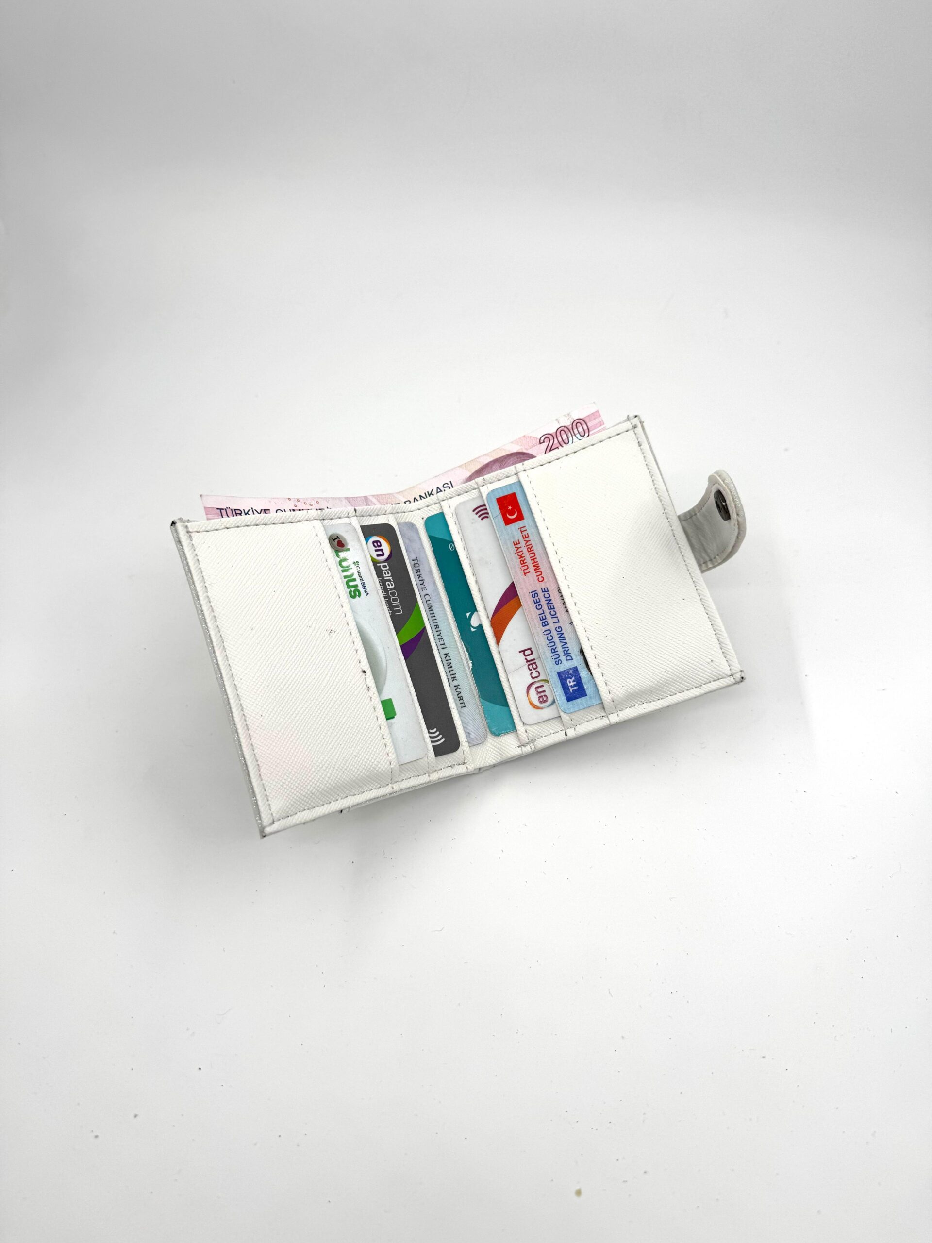 Günlük kullanım için tasarlanmış bu beyaz simli kartlık cüzdan, modern ve sade tarzıyla hem şıklık hem de pratiklik sunar. Kaliteli suni deri malzemeden üretilmiş olup, sağlam dikişleri ve tokalı kapama sistemiyle kartlarınızı güvenle saklamanızı sağlar. Kompakt yapısı sayesinde cepte kolayca taşınabilir. 10 adede kadar kart bölmesi ile ihtiyacınıza cevap verir.