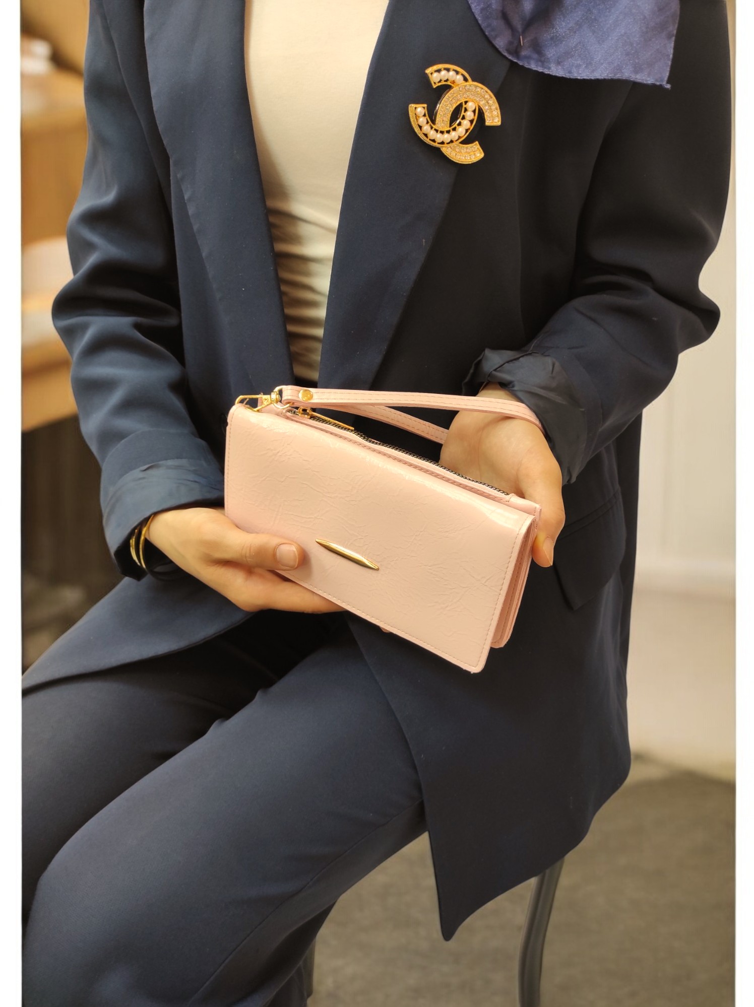 Elden Askılı Fermuar Detaylı Kadın Pudra Cüzdan El Çantası