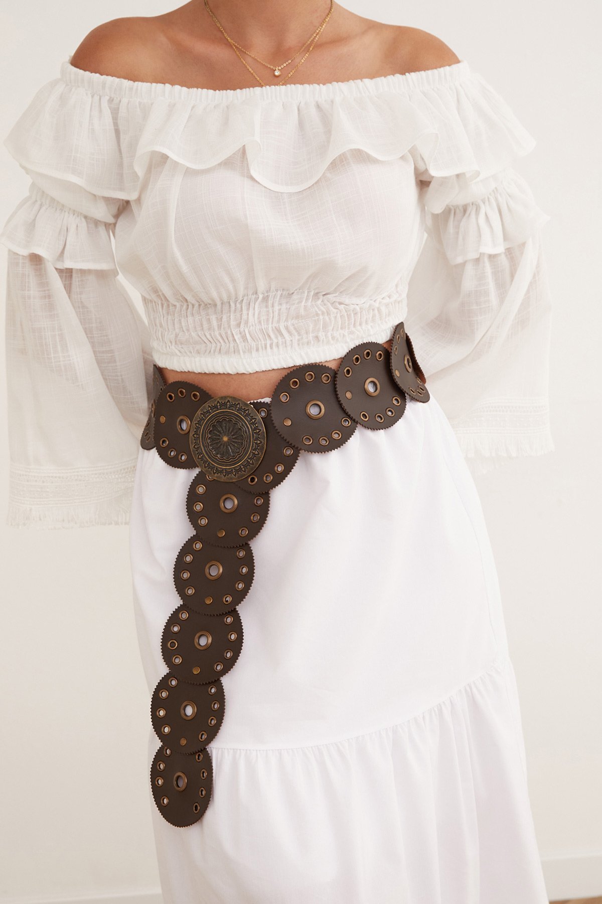 Kadın Bohem Suni Deri Metal Halkalı Dekoratif Kahverengi Kemer – Antik Gold Tokalı, Yuvarlak Parçalı Tasarım