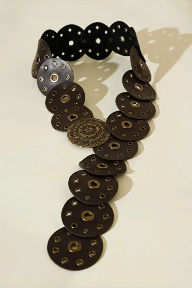 Bu özel tasarım kadın kemeri, bohem şıklığı ve el işçiliği detaylarını bir araya getirir. Yuvarlak deri halkaların birleştirilmesiyle oluşturulan yapısı, antik gold işlemeli büyük tokasıyla dikkat çeker. Elbiselerde, eteklerde ve yaz kombinlerinde dekoratif aksesuar olarak kullanılabilir. Bohem, etnik ve vintage tarz seven kadınlar için mükemmel bir tamamlayıcıdır.