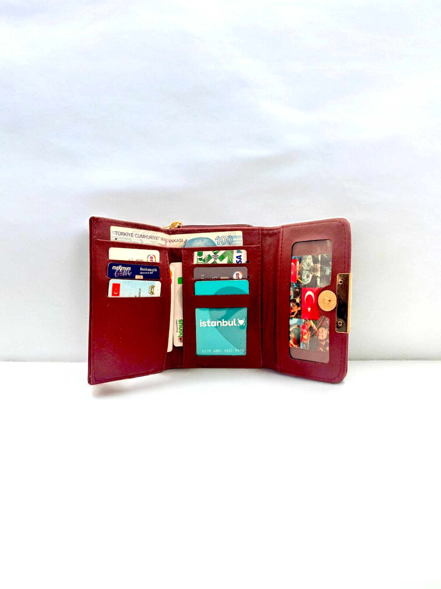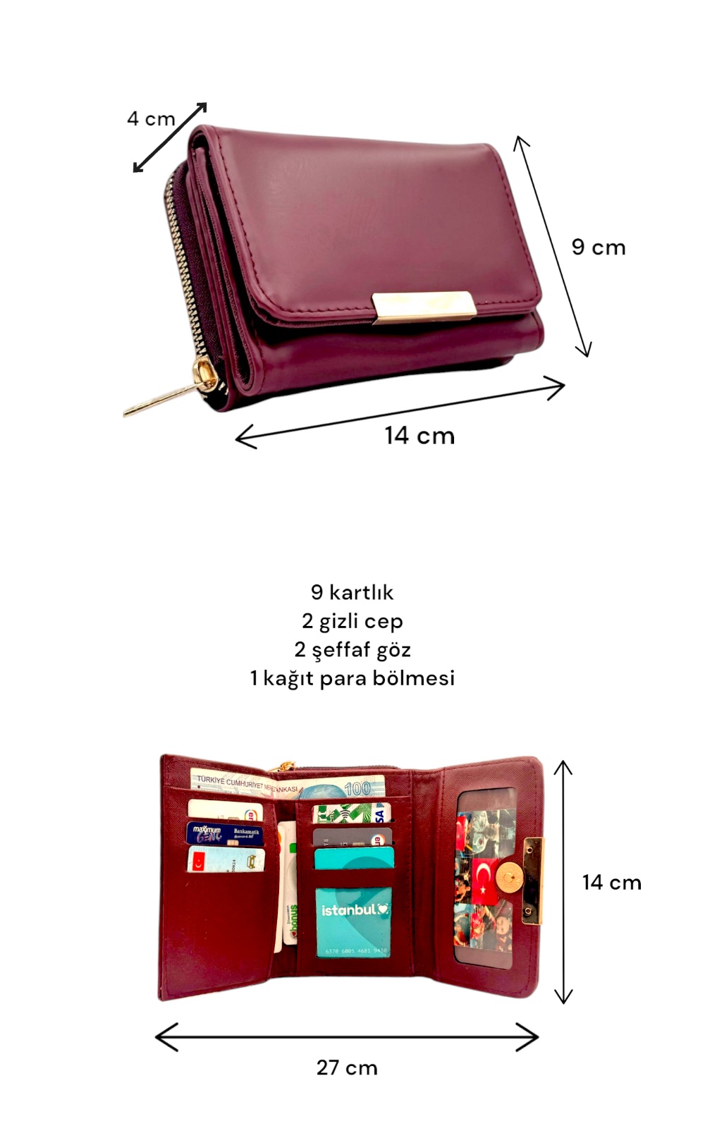 • İç kısımda 9 adet kartlık bölmesi (2’si şeffaflı ve 2’si gizli cep şeklindedir)ve 1 adet kağıt para bölmesi bulunmaktadır.