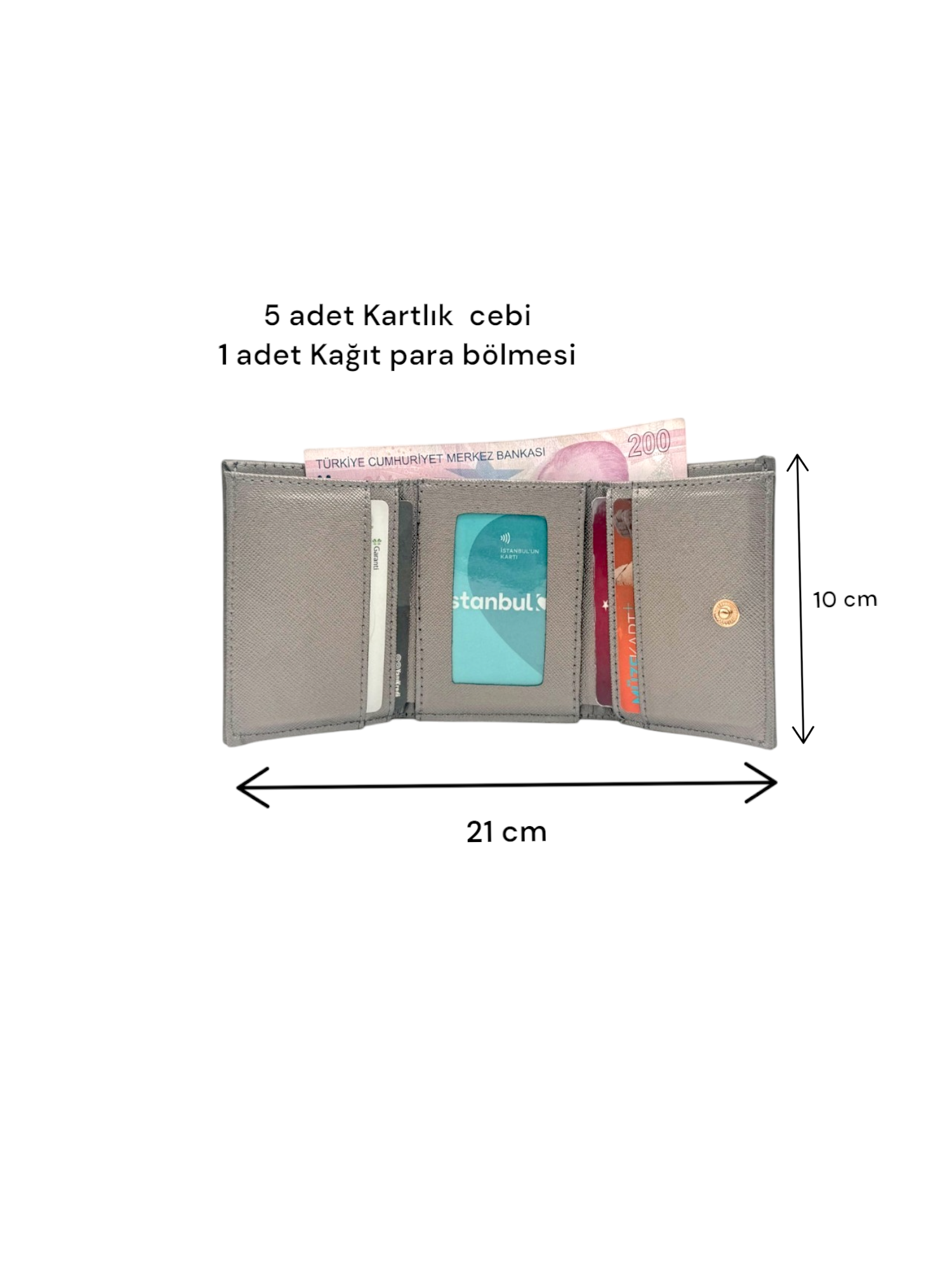 • Kapak açık boyu 21 x 10 cmdir. 5 adet kart haznesi ve 1 adet kağıt para koyabileceğiniz bölüm bulunmaktadır.