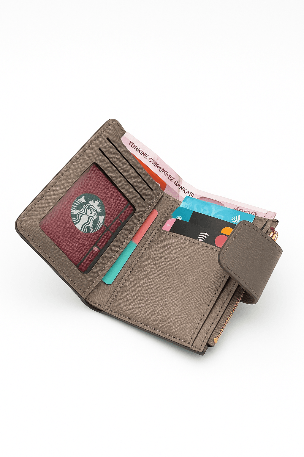 Kadın Fermuarlı Kartlıklı Cüzdan – Deri Görünümlü, Bozuk Para Gözlü