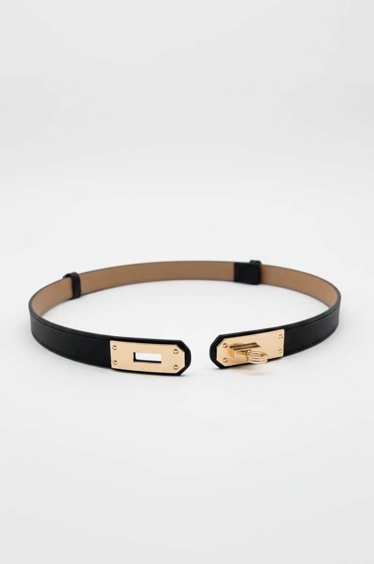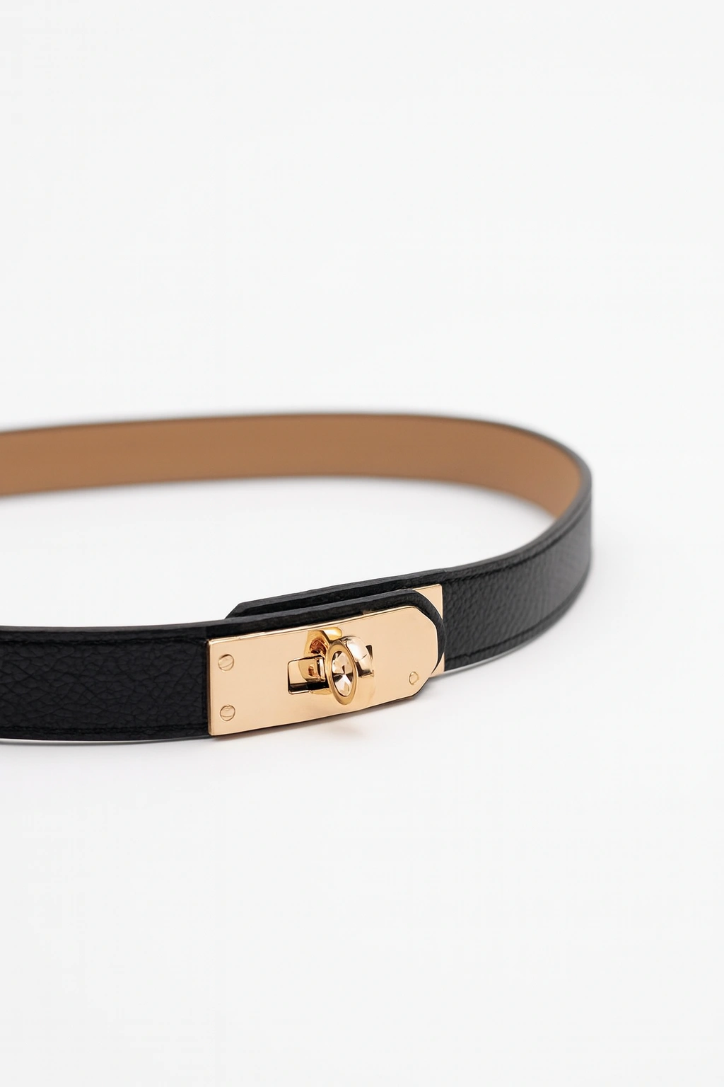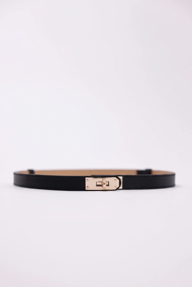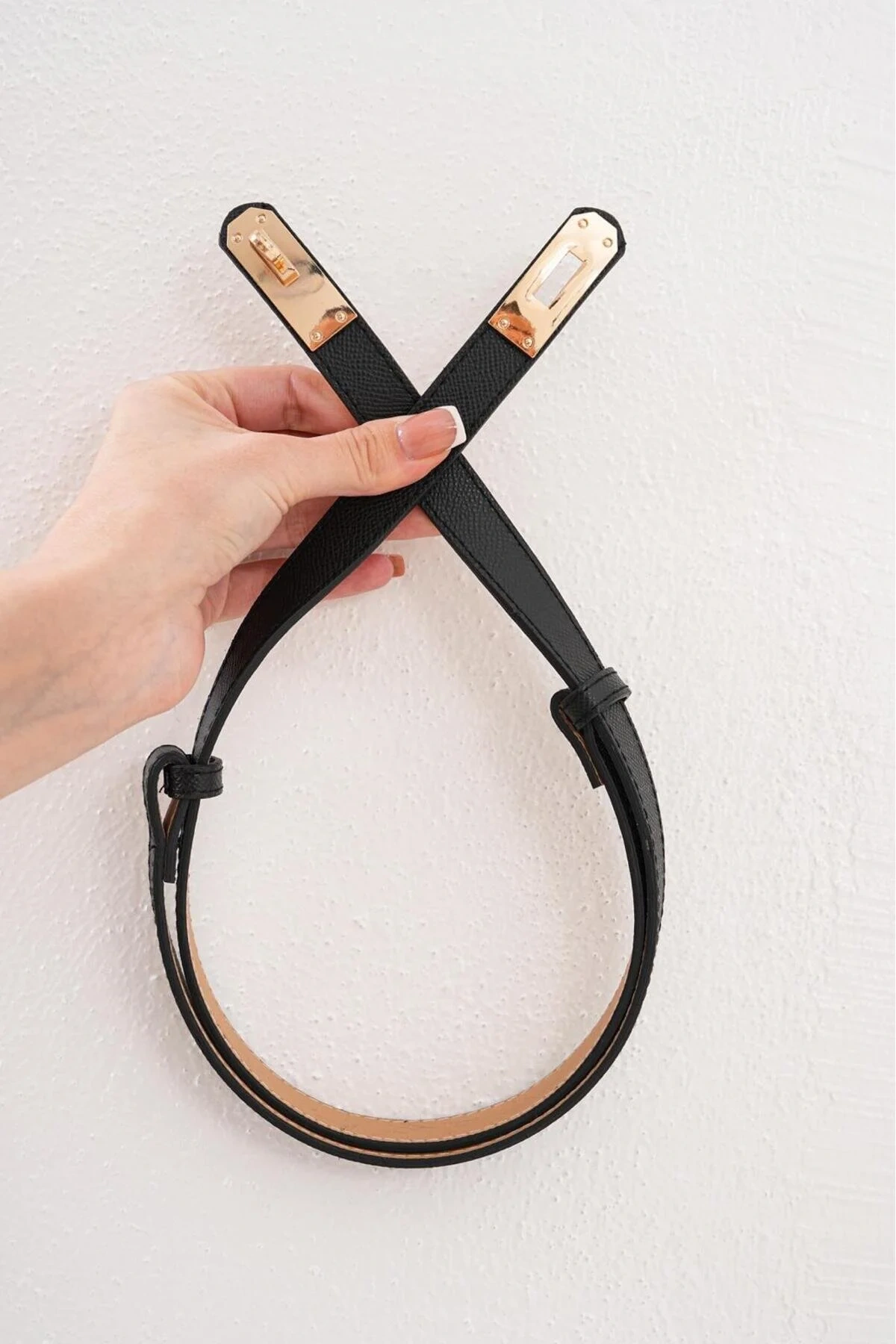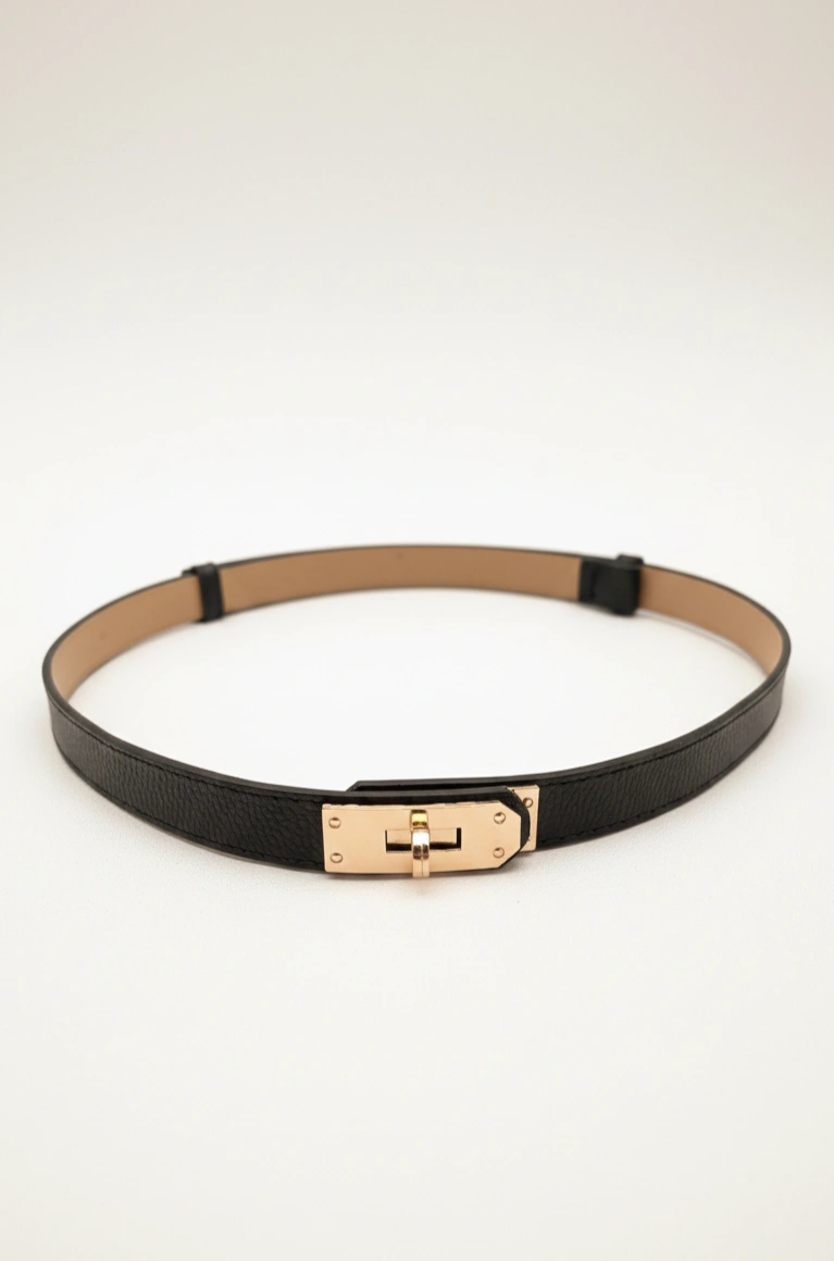 Kadın İnce Gold Kilit Tokalı Suni Deri Kemer – Arkadan Ayarlanabilir, Şık Elbise & Jean Uyumlu
