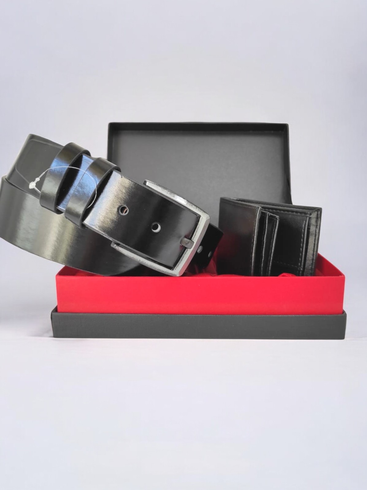 Özel Hediye Kutulu 2’li Set Hediyelik Şık Suni Deri Erkek Parlak Kot Kemer Cüzdan Seti